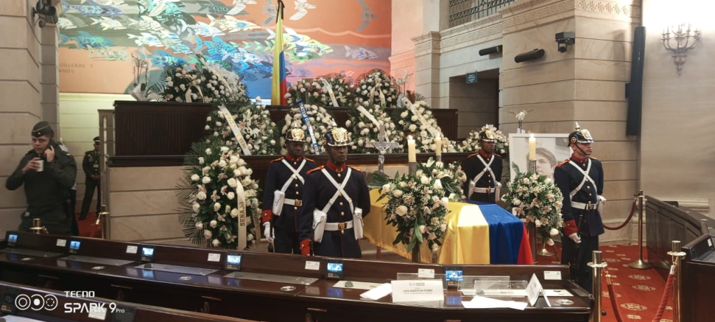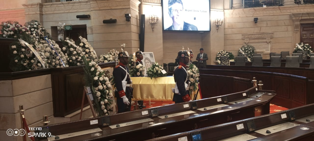 Sobre las 7:36 a. m. salió el cuerpo del senador de la Fundación Santa Fe. El cuerpo del senador por el Centro Democrático será velado en cámara ardiente en el Congreso de la República.