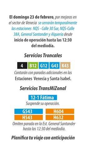 Por otra parte, el domingo 23 de febrero, las estaciones NQS – Calle 30 Sur, NQS – Calle 38A, General Santander y Alquería iniciarán operación desde las 12:30 del día debido a intervenciones en las obras del sector de Venecia.