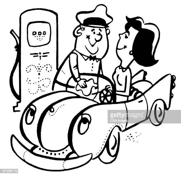 Woman in convertible at Gas Station with Attendant Wiping Windshield