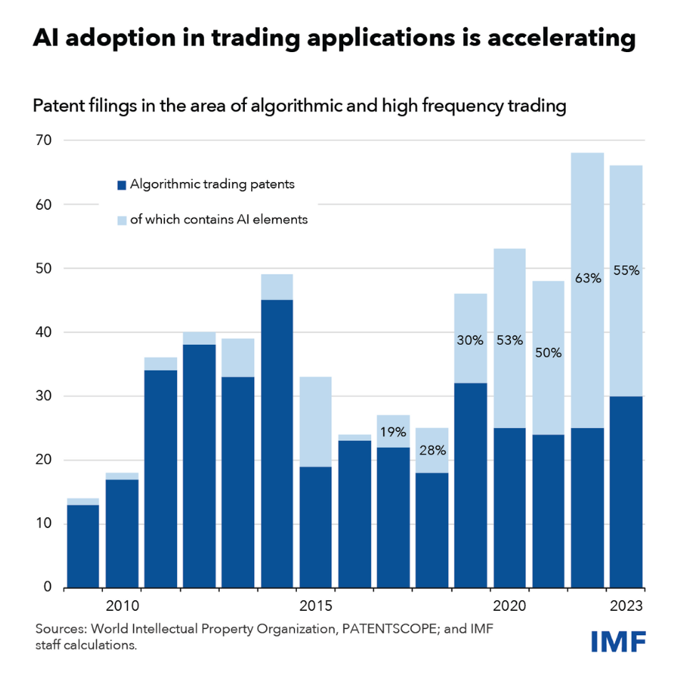Desde que comenzaron a aparecer los grandes modelos de lenguaje, o LLM, en 2017, la proporción de contenido de IA en las solicitudes de patentes relacionadas con el comercio algorítmico ha aumentado del 19 por ciento en 2017 a más del 50 por ciento cada año desde 2020, lo que sugiere que se avecina una ola de innovación en esta área.
