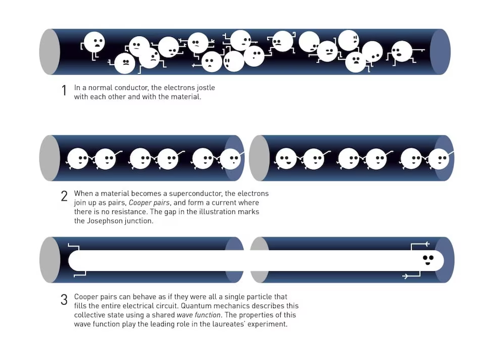 Los físicos se preguntaron rápidamente si sería posible investigar un tipo de efecto túnel que involucrara más de una partícula a la vez. Los laureados utilizaron superconductores, materiales en los que los electrones individuales se organizan formando pares, llamados pares de Cooper. Estos pares se comportan de manera completamente diferente a los electrones ordinarios y pueden describirse como una sola unidad, un sistema de mecánica cuántica.