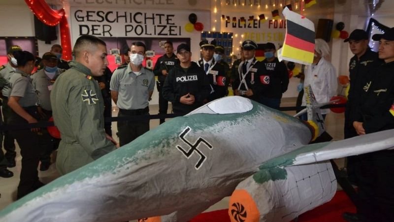 Algunos cadetes de la escuela vistieron uniformes nazis, mientras que en un salón fueron desplegadas banderas alemanas, símbolos como la esvástica y letreros en alemán como uno que decía «Historia de la policía».